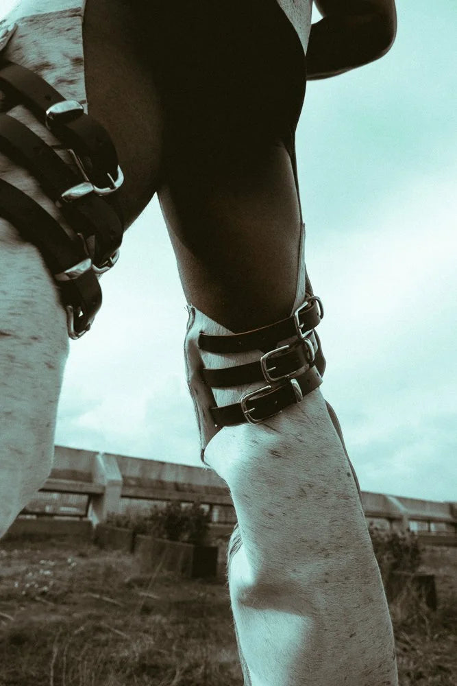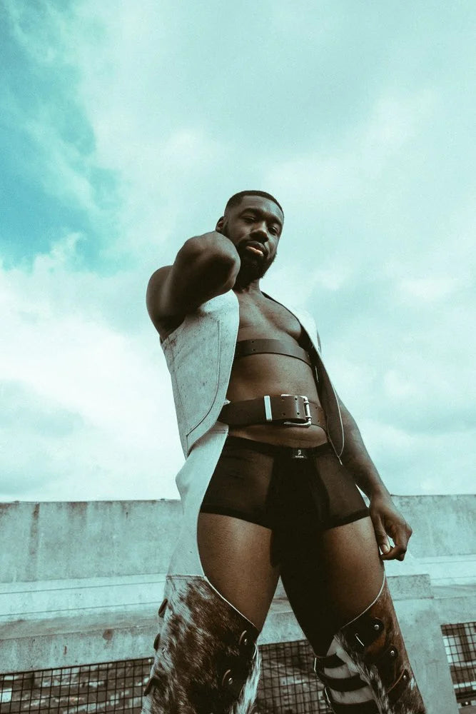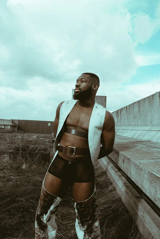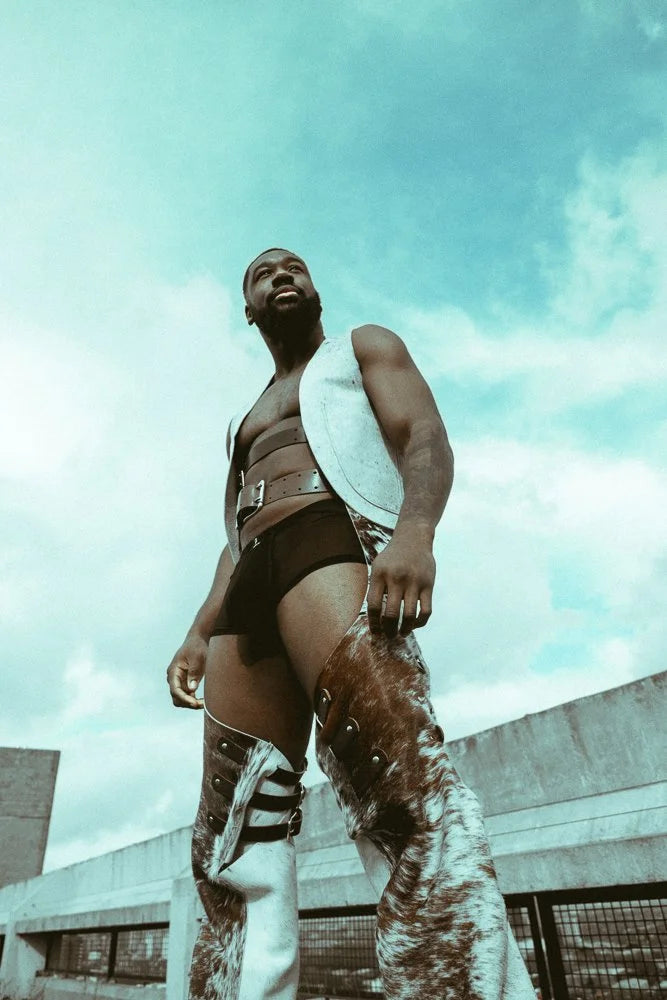 No two pairs of our cow hair hide leather chaps will ever be the same—each one carries a unique cowhide pattern, making it a one-of-a-kind statement piece. The structured leather belt and upper thigh buckles (in your choice of leather colour) give you full control over the fit, while the triple buckles on each thigh add a bold style element. With poppers running up the leg for adjustable movement (and a breeze when you need it), these chaps bring together rugged attitude and sleek craftsmanship. A true homage to urban cowboys, designed for those who know how to own a look. Naturally genderless, these are made for anyone ready to take up space.