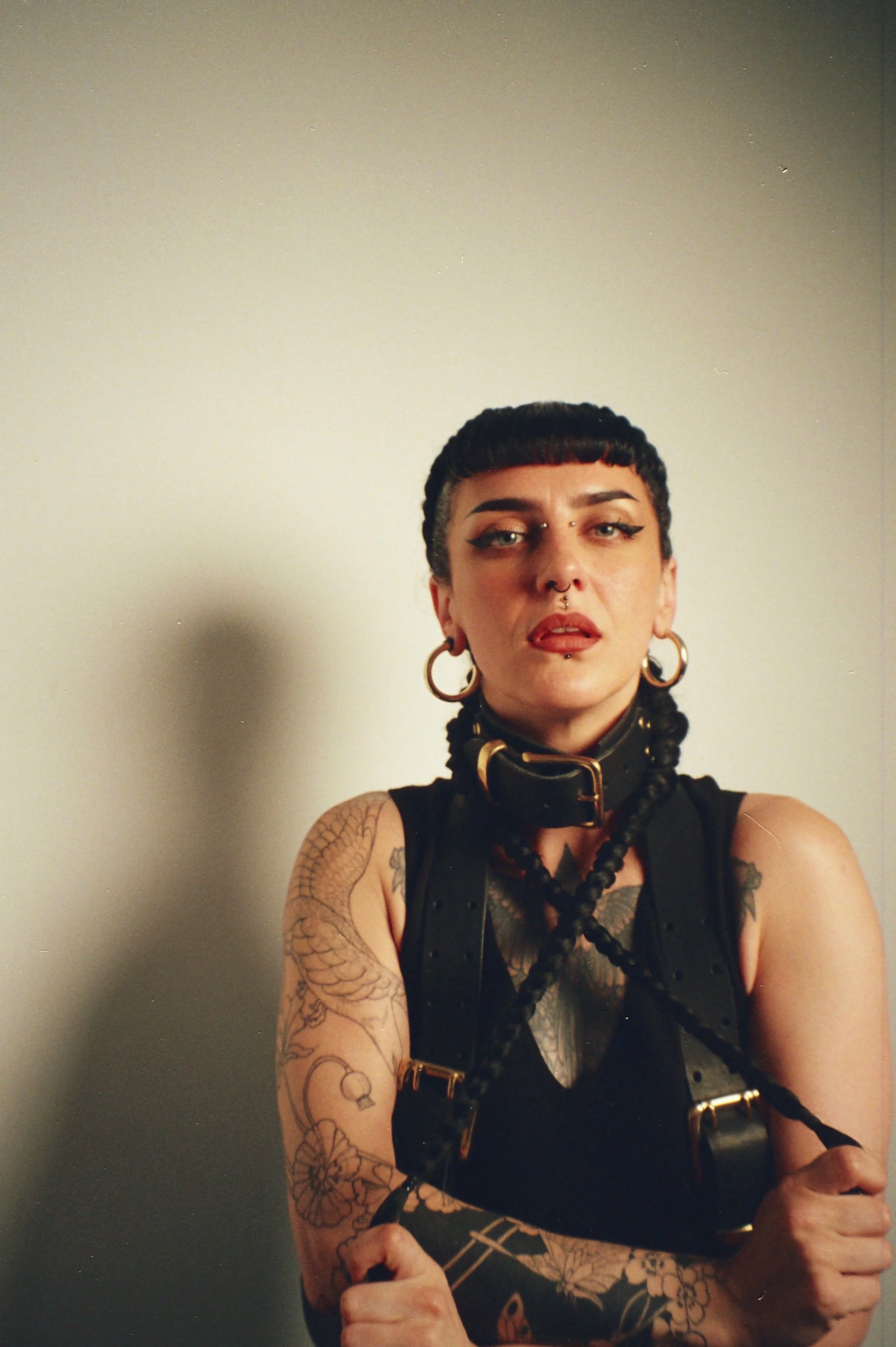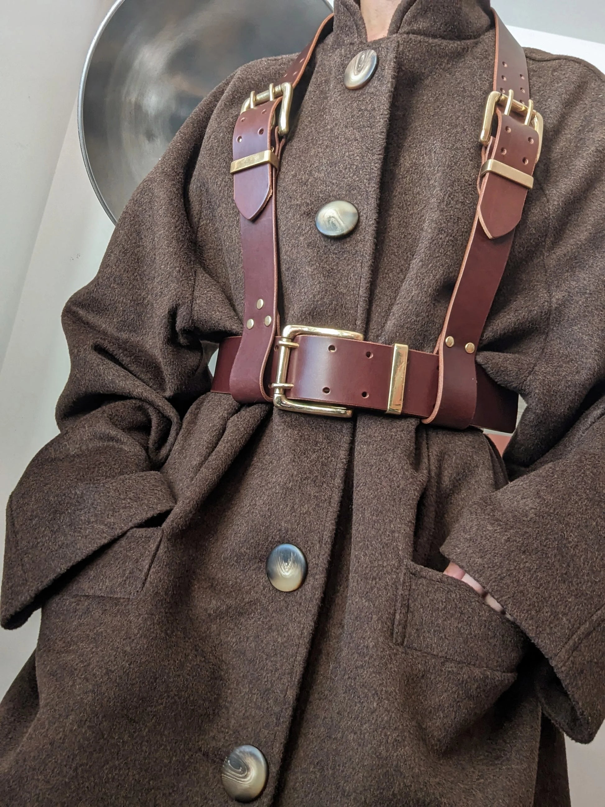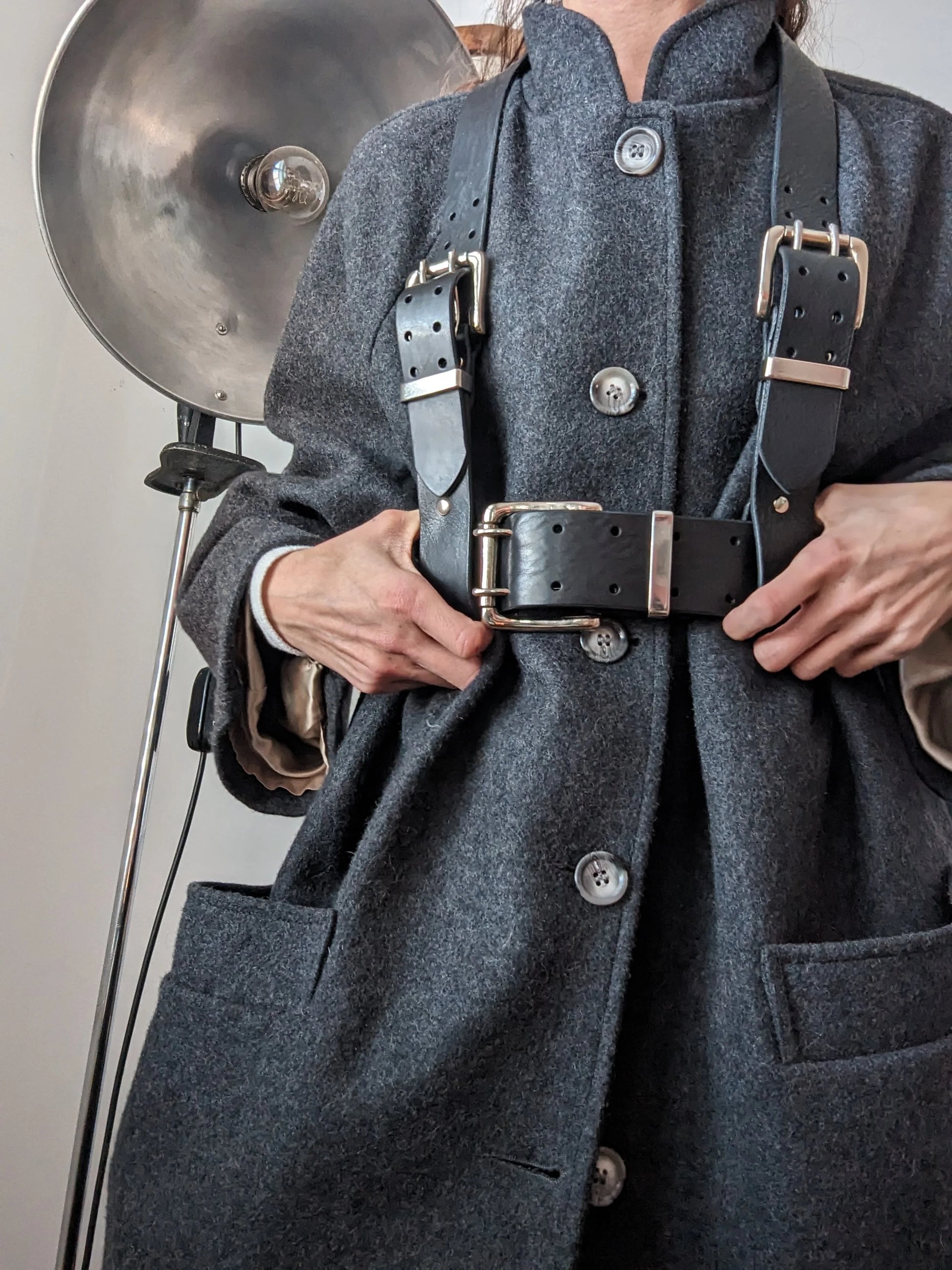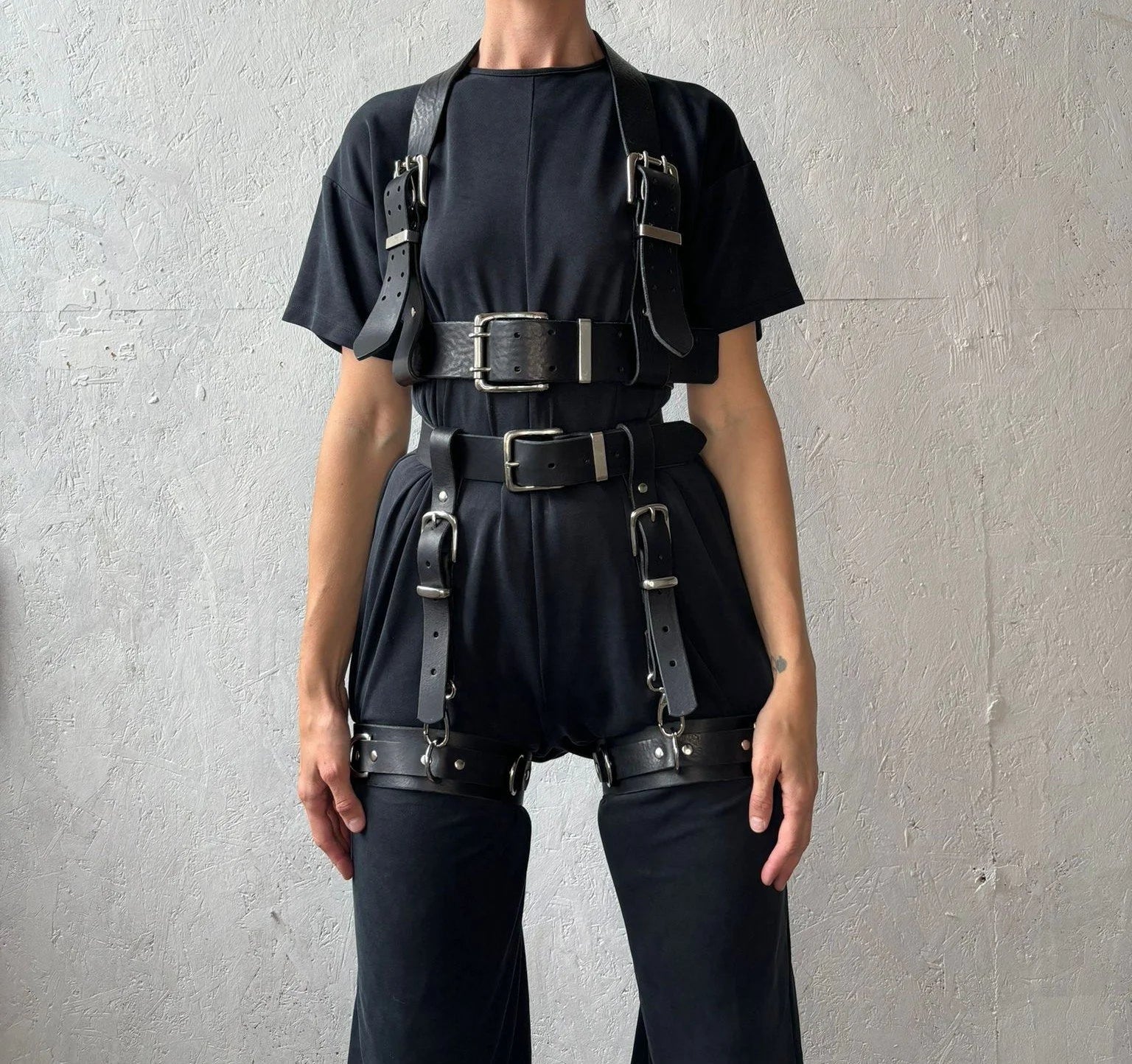 We needed a reason to celebrate the double prong buckles. If you're partial to a masc style harness, look no further. If you wanted something to wear over pretty much everything you own, stay right here. Invest in this god damn gorgeous underbust/chest/waist harness. It will enhance the fabrics you wear underneath (latex to wool) we’ve tried. The security you feel wearing these extra thick straps are posture informing and absolutely giving with the silhouette, bulking us up for the nude moments. The back is a classic and simplistic halter connected by a large ring on the back of the neck.