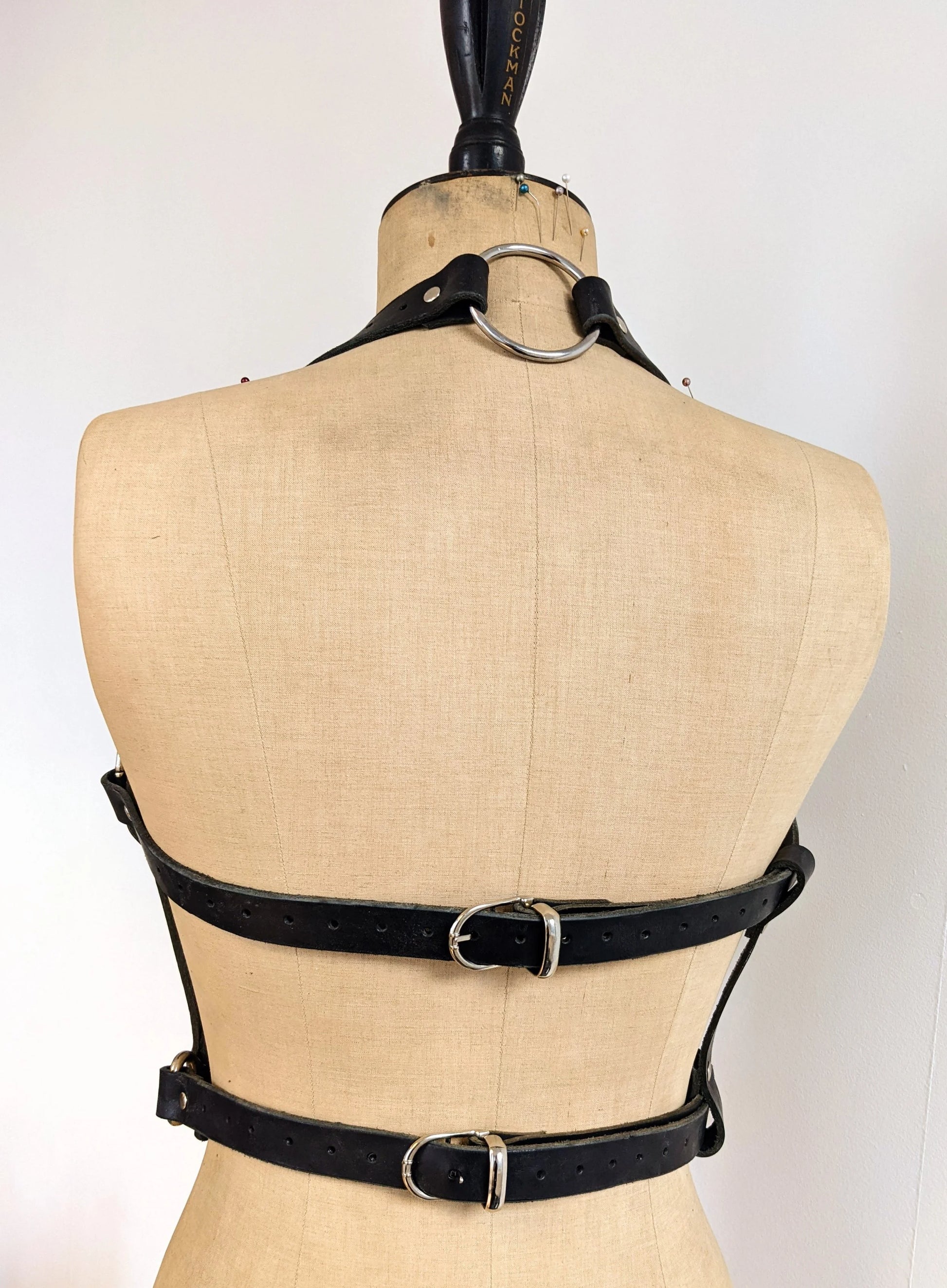 Unisex and fitting between XS-L - 4 points of adjustment, over the shoulders and two around the waist. The first strap around the back lines up with the underbust and the second on your waist. The shoulder straps can allow you to move the whole harness to sit lower if desired.