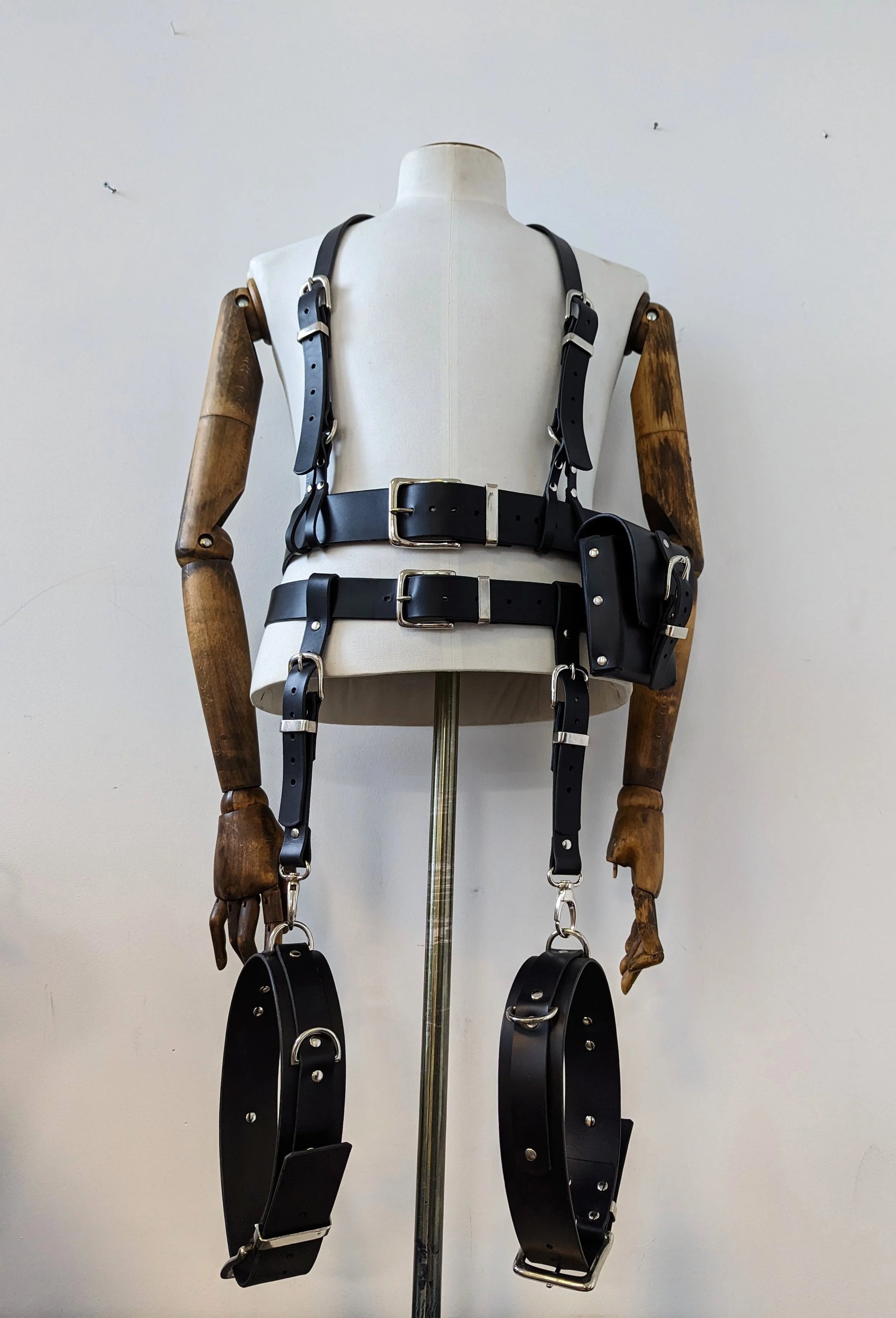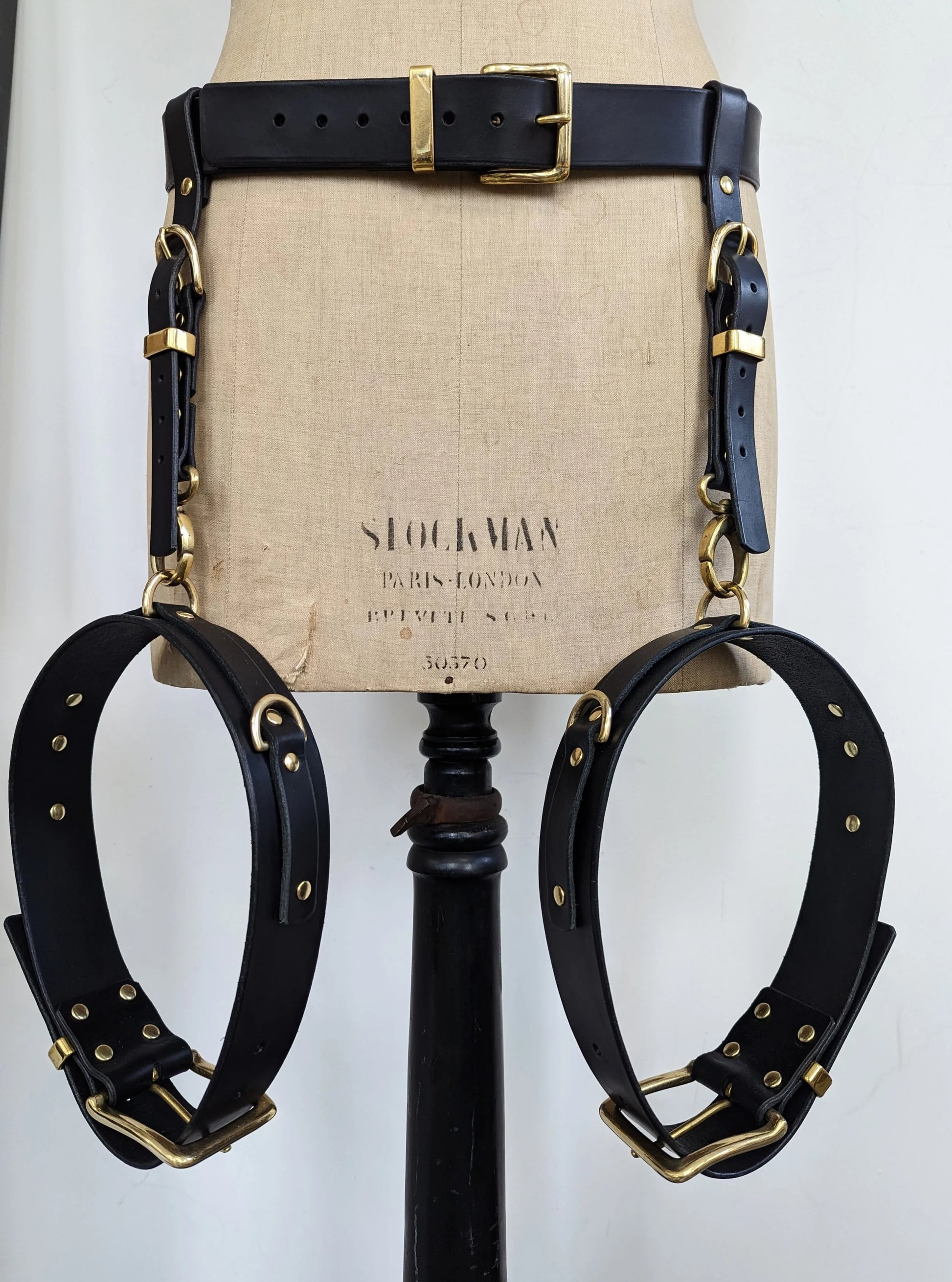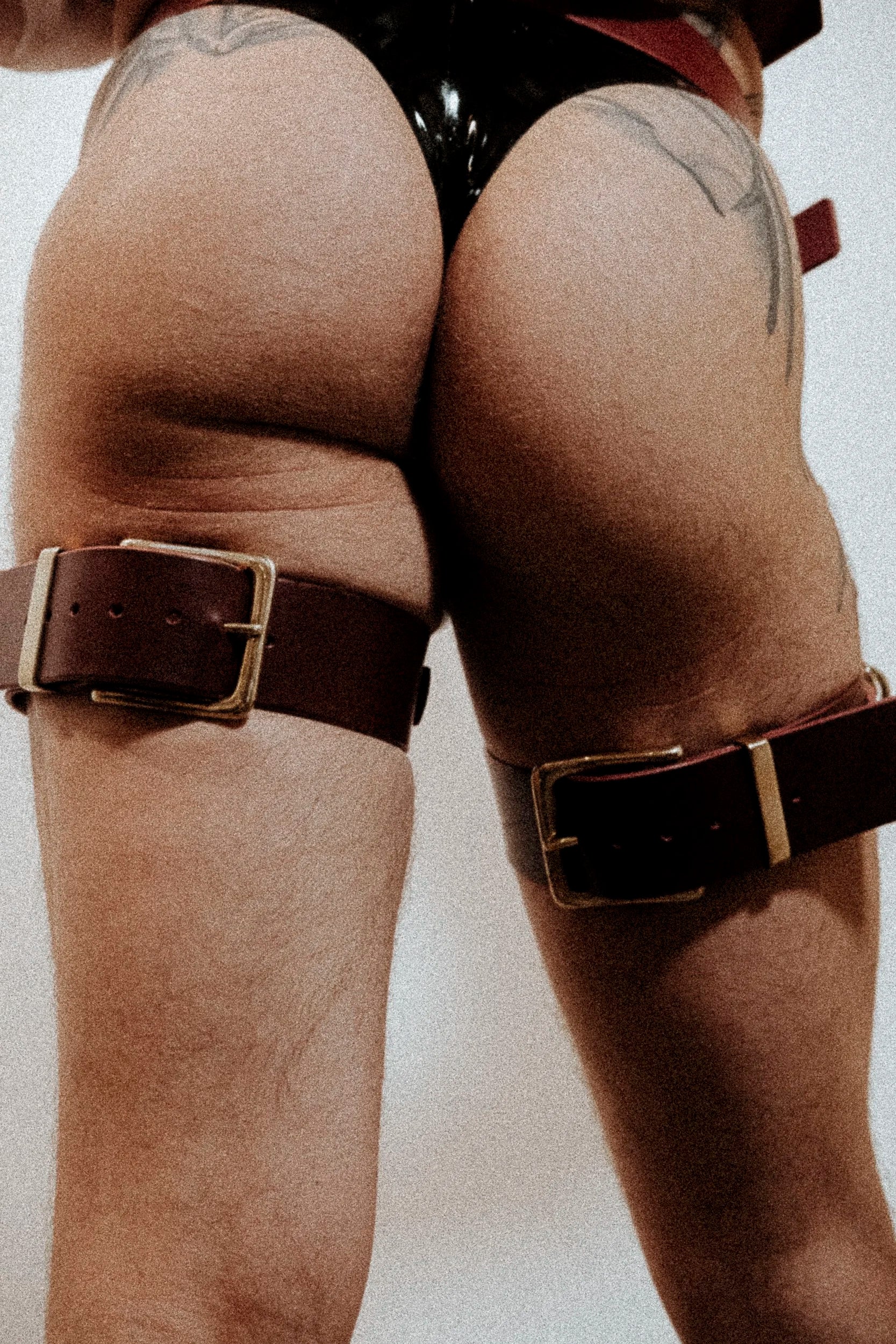 Introducing our body structuring piece that will need to enter your leather collection - the Thigh Cuff Leg Suspenders. This unique and versatile piece combines thick thigh cuffs with a waist belt and straps down the thighs, making it the perfect addition to be worn solo or build up from your chest harness. The 5cm buckles of the thigh cuffs provide sturdy support, while the three added D rings on each leg offer easy clip-on access for suspenders and implements. Available in a range of leather colours and hardware options, this piece is perfect for anyone looking to elevate their style and feel confident in their body, especially men and masc identifying people. With its thick straps and sturdy design, the Thigh Cuff Leg Suspenders will have you feeling powerful and ready to take on anything.