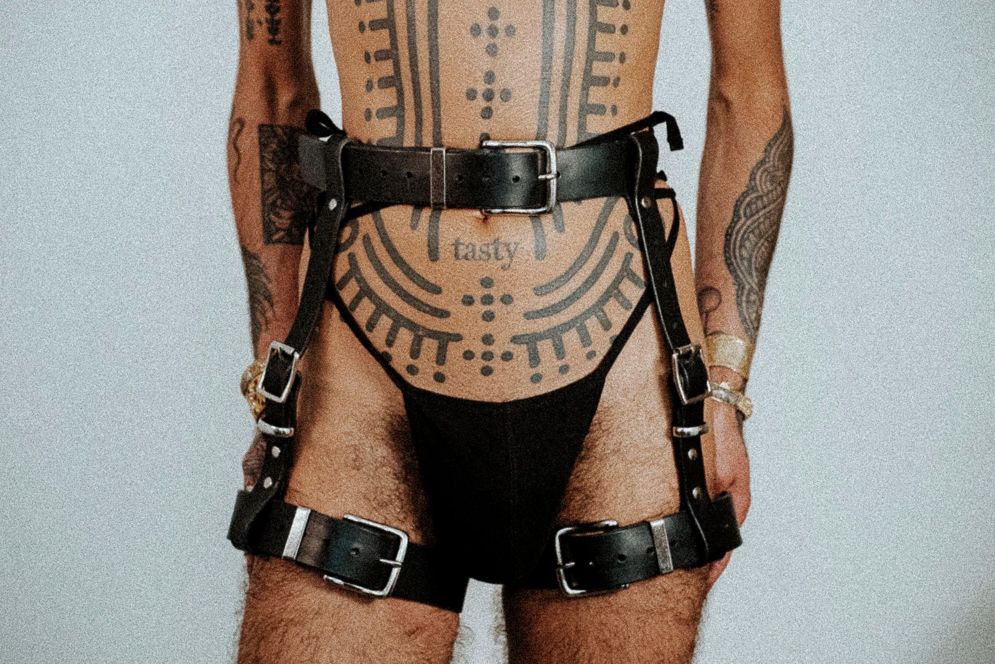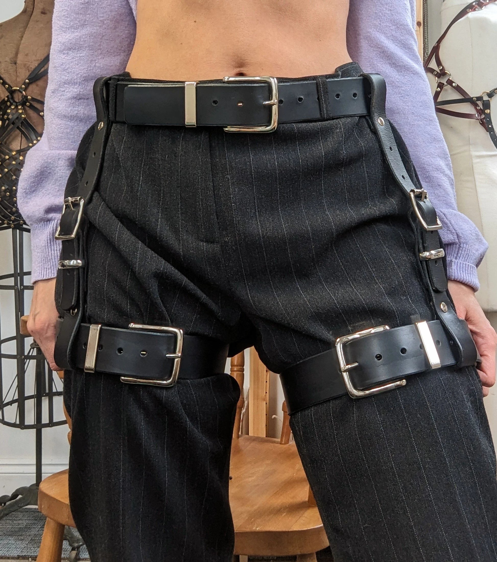 Introducing Primal's leather leg suspenders, designed to give you a powerful, commanding look. Made from high-quality leather, these suspenders feature a sturdy waist belt and two belted leg straps, providing an amazing lift to your buttocks and framing the waist to thigh area perfectly. To ensure a perfect fit, please include your upper thigh circumference (measured right under the buttocks) and your belt/waist measurement in the order note. Elevate your style with these strong and stylish leg suspenders, a must-have for any leather enthusiast.